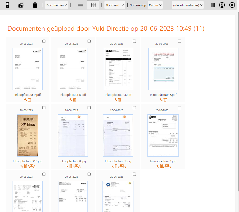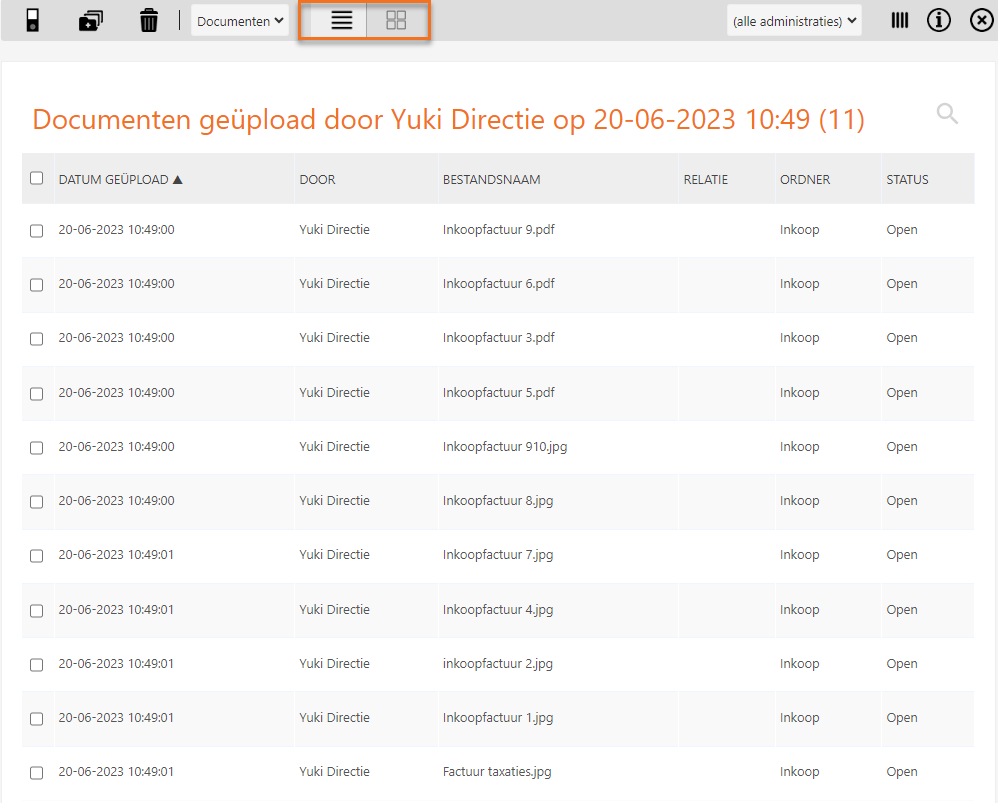 Je kunt in dit scherm kiezen of je de geüploade documenten wilt weergeven in een lijst of als miniatuurweergaven.